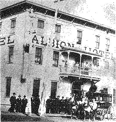 For the convenience of people arriving by train, hotels each had their horse-drawn bus. Shown here is the one owned by the Albion Hotel. The driver, sitting in the customary place on top, is Malcolm Shaw.